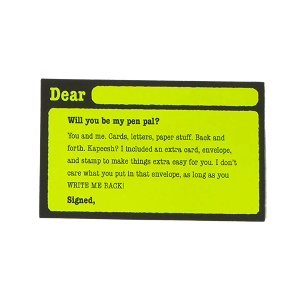 Send a card, get one back! Write Me Back! Pen pal kits make it super easy to write to a friend, and for them to write you back. When you send your card, you'll also send a miniature card and envelope, so your friend can write back to you, right from their mailbox!